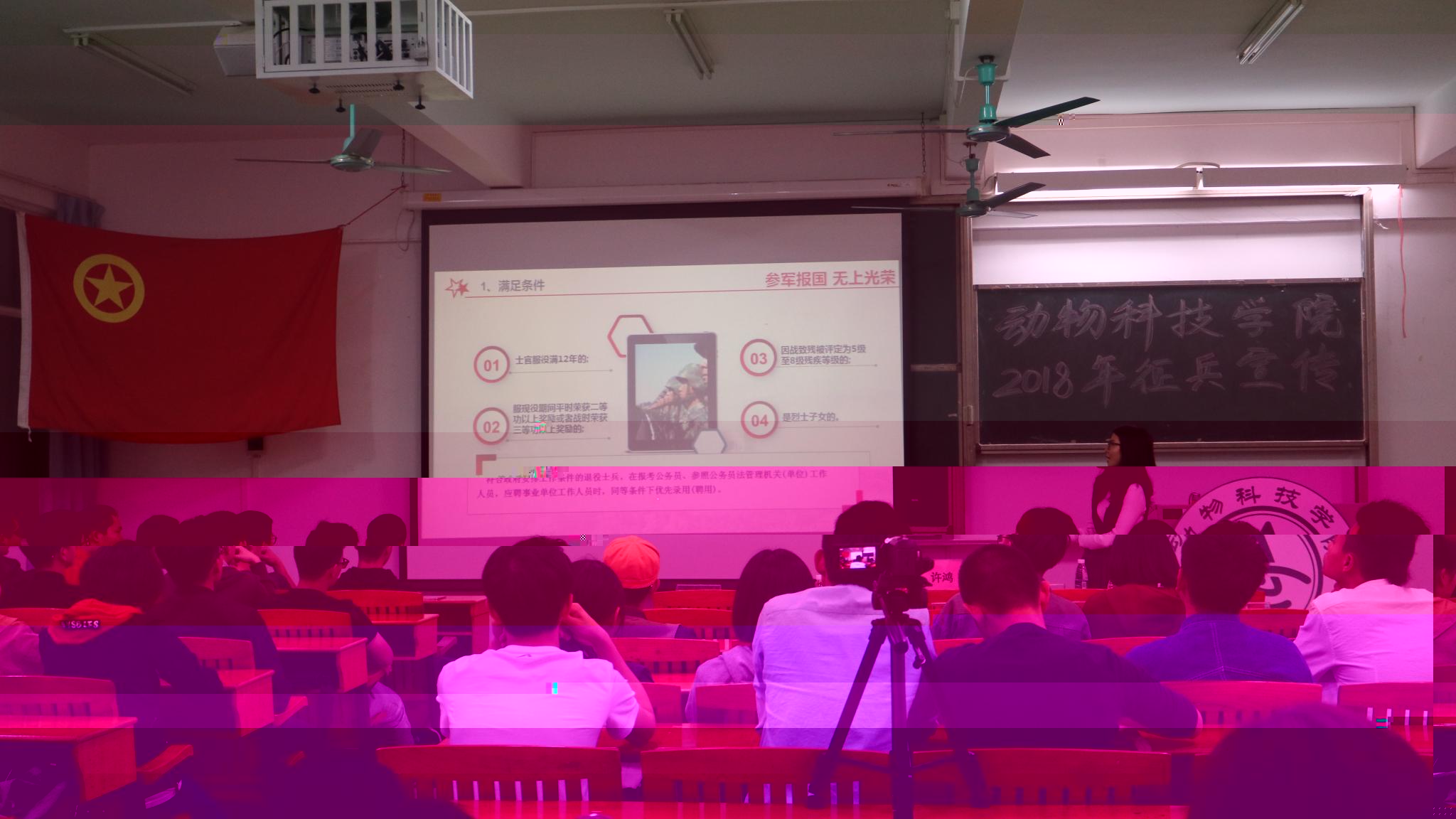 2018年3月22日晚上太阳成集团tyc234cc在白雲校區楊钊楊勳樓308室舉行征兵宣傳活動。會議由太阳成集团tyc234cc輔導員許鴻老師主持,太阳成集团tyc234cc2017屆的三名學生教官、退伍義務兵岑靖運和動科院學生參加了本次活動。