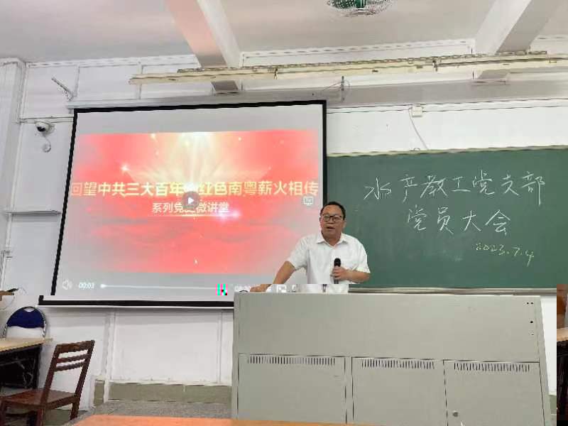 為深入推進學習貫徹習近平新時代中國特色社會主義思想主題教育走深走實,進一步推動學院各項工作高質量發展,7月4日,學院院長林蠡在海珠校區教學樓203為水産養殖教工黨支部黨員講授黨課,黨課由學院黨委副書記李昌輝主持。